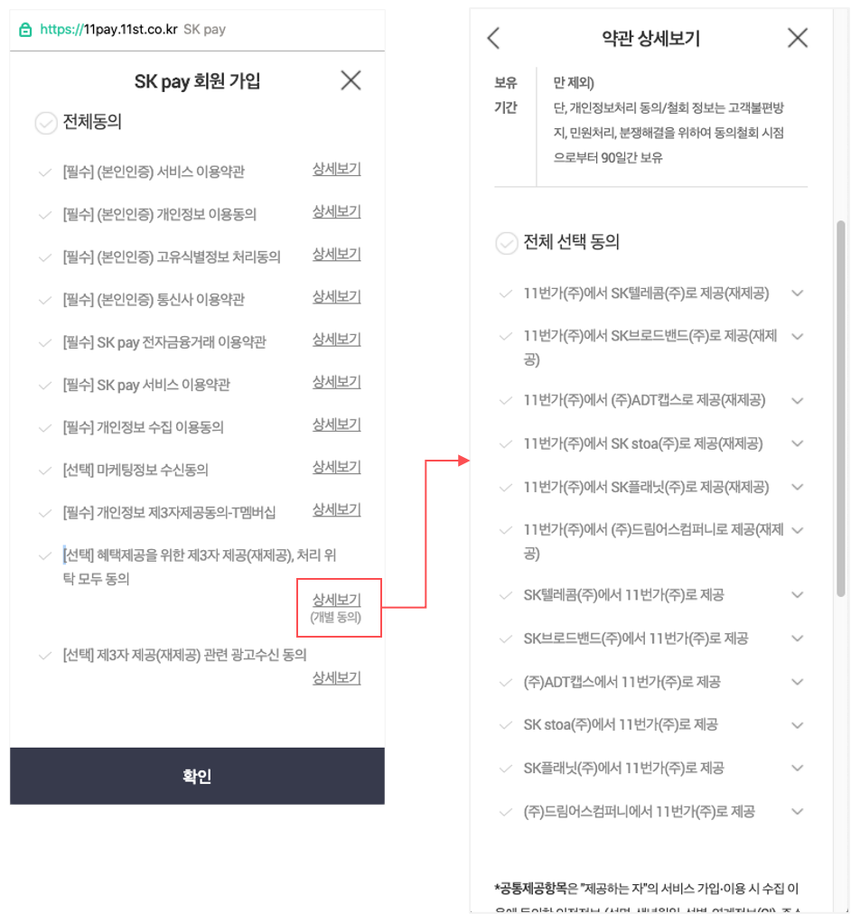 개별 약관의 체크 버튼은 타 체크 버튼과 달리 버튼 UI로 되어 있지 않은 데다, 필수 약관과 선택 약관이 뒤섞여 있으며, (개별 동의)라고 표시해두고 어마 무시한 개인정보 제 3자 제공 동의 약관을 넣어놨다. 약관의 개수도 많다 보니 보통 전체 동의를 누를 듯싶은데 누르면 당신의 개인정보가 SK의 계열사와 자회사에 함께 전달된다. 그 이후는 말 안 해도 알겠지! :(