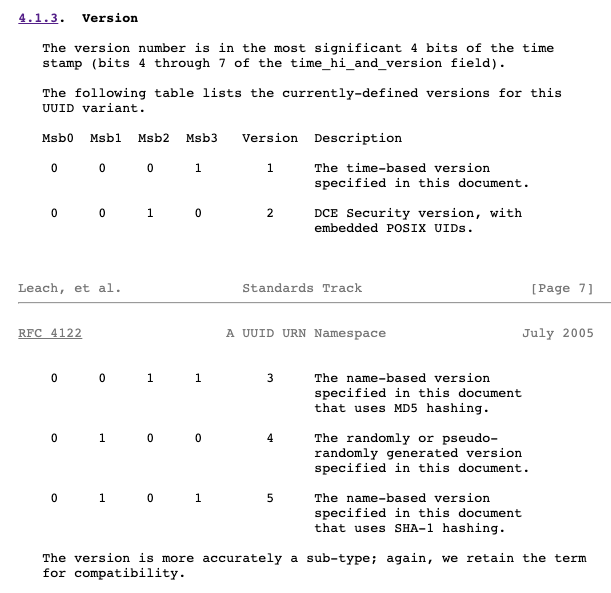 UUID는 국제 인터넷 표준화 기구인 ietf에서 정식 표준으로 채택된 표준 프로토콜로 RFC 4122 문서를 기반으로 생성한다.