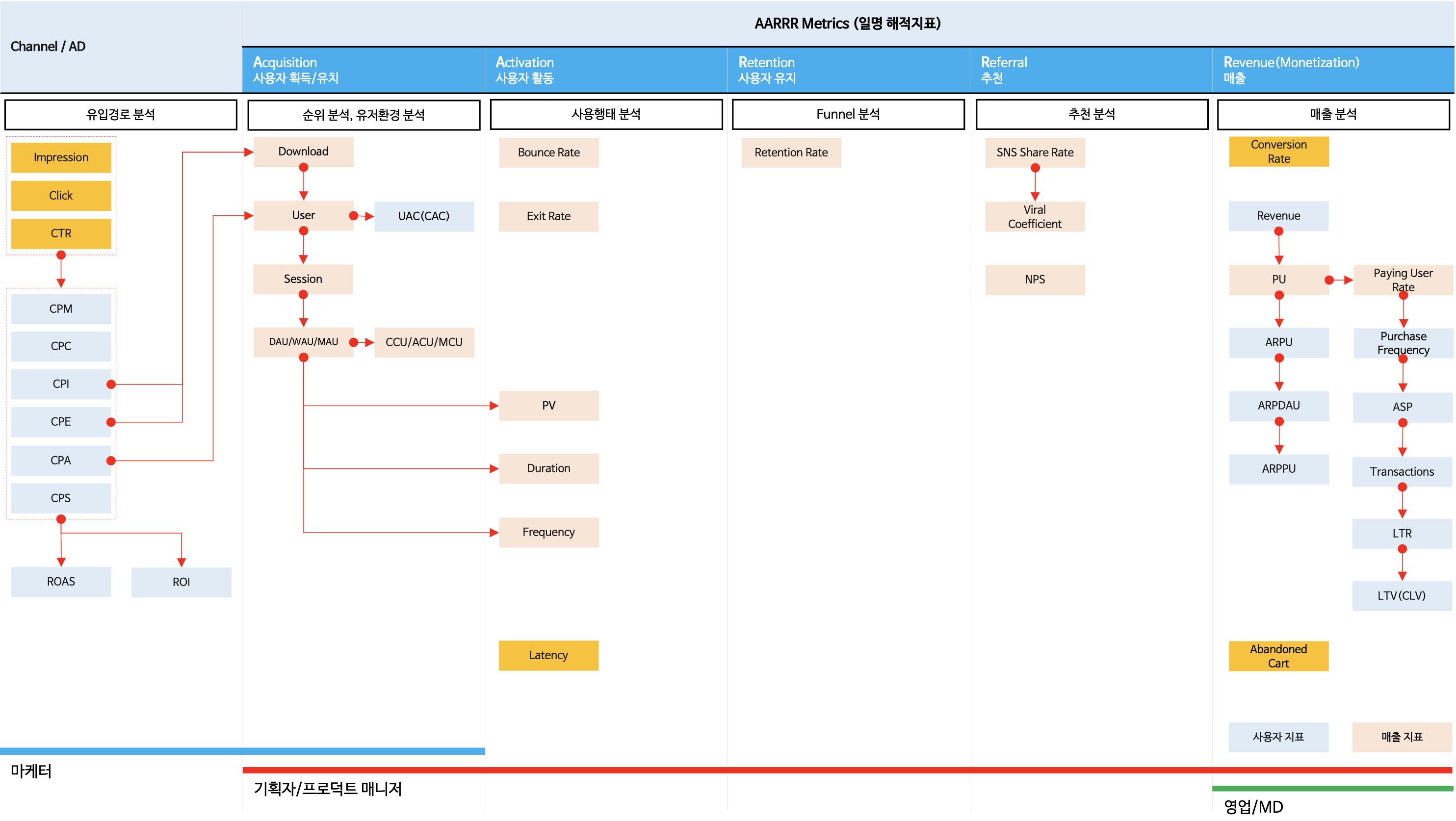 AARRR은 500 Startups의 공동 설립자인 데이브 맥클루어(Dave McClure)가 개발한 스타트업의 성장을 측정하고 성장 전략을 수립하기 위한 프레임워크로, 획득(Acquisition), 활성화(Activation), 유지(Retention), 추천(Referral), 수익(Revenue)의 다섯 단계로 나눠 측정한다.