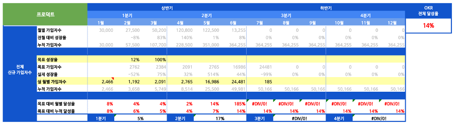 전사 및 직군별 OKR 작성이 완료되면, 그 KR에 따른 KPI 지표를 측정하기 위해 수치를 기록할 수 있는 아래와 같은 양식을 만들어 공유한다. 그리고 해당 양식에 맞춰 수치 및 그 성장률을 기록한다. 나는 매주 진행되는 경영진 또는 리더 미팅에서 해당 지표를 공유해야 하므로 그전에 각 직군이나 작성에 의무가 있는 담당자가 해당 수치를 입력하도록 한다.