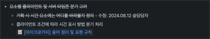칸반이나 위키와 같은 협업 툴은 꾸미기에 시간을 들이지 않고 내용에 집중하며 문서를 작성하고 쉽게 공유할 수 있게 한다. 문서의 유형에 따라 일정한 양식을 제공할 수 있도록 템플릿 기능을 지원하고 있어서 모든 구성원이 문서를 쉽고 빠르게 작성하고 이해할 수 있다. 그래서 나는 반복적으로 작성되는 문서 유형은 아래와 같이 작성 양식을 만들어 제공한다.