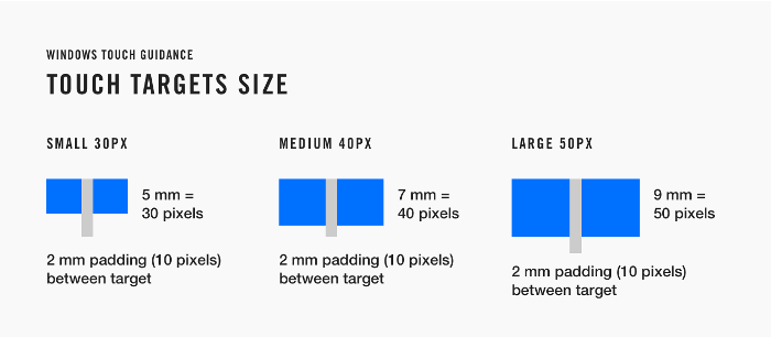 • 터치 대상의 크기는 사용자가 쉽게 인식하고 정확하게 선택할 수 있도록 충분히 커야 한다.